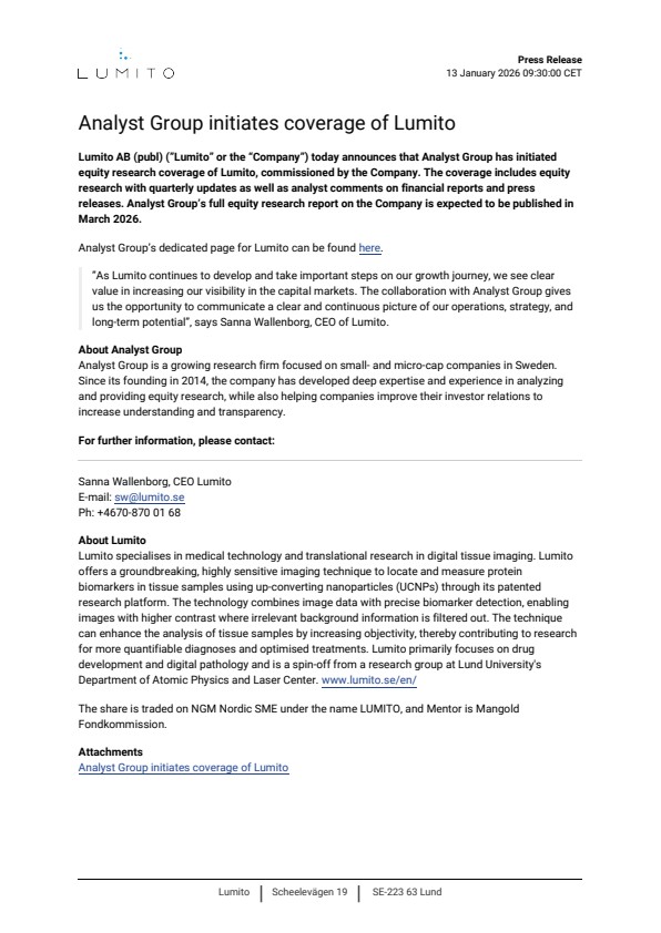 Lumito AB (publ) (”Lumito” or the “Company”) today announces that Analyst Group has initiated equity research coverage of Lumito, commissioned by the Company. The coverage includes equity research with quarterly updates as well as analyst comments on financial reports and press releases. Analyst Group’s full equity research report on the Company is expected to be published in March 2026.