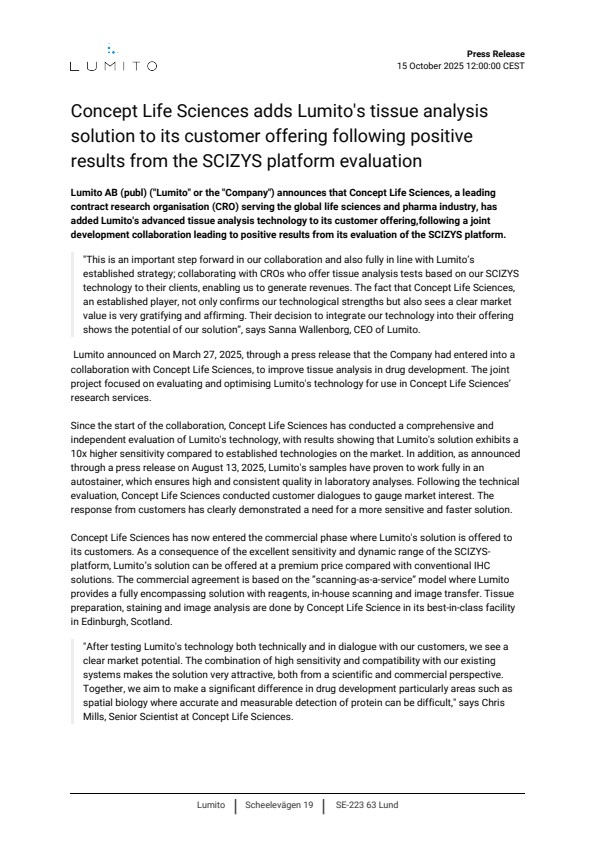Lumito AB (publ) ("Lumito" or the "Company") announces that Concept Life Sciences, a leading contract research organisation (CRO) serving the global life sciences and pharma industry, has added Lumito's advanced tissue analysis technology to its customer offering,following a joint development collaboration leading to positive results from its evaluation of the SCIZYS platform.