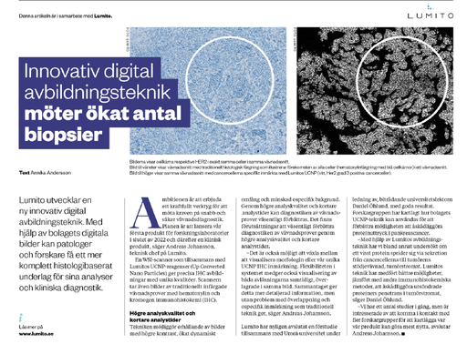 Lumito är specialiserat inom medicinsk teknik för digital patologi. Genom sin egenutvecklade och patenterade teknologi vill Lumito ge vårdgivarna ett kraftfullt verktyg för att möta kraven på snabb och säker vävnadsdiagnostik i den individanpassade sjukvården. Tekniken möjliggör bilder med större kontrast där oväsentlig bakgrundsinformation sorteras bort, vilket gör det lättare för patologer att hitta cancerindikationer. Tekniken som baseras på uppkonverterande nanopartiklar (UCNP – Up Converting Nano Particles) har förutsättningar att väsentligt förbättra diagnostiken av vävnadsprover genom högre kvalitet av analyserna och kortare analystider. Metoden har flera potentiella användningsområden, men i första hand har Lumito valt att fokusera på digital patologi. Bolaget är en spinoff från en forskargrupp vid Lunds universitets avdelning för atomfysik och lasercentrum. www.lumito.se.