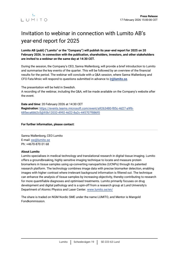 Lumito AB (publ) (“Lumito” or the “Company”) will publish its year-end report for 2025 on 20 February 2026. In connection with the publication, shareholders, investors, and other stakeholders are invited to a webinar on the same day at 14:30 CET.
