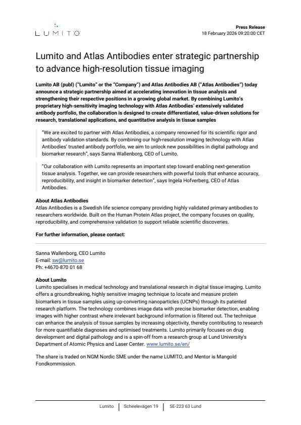 Lumito AB (publ) (“Lumito” or the “Company”) and Atlas Antibodies AB (“Atlas Antibodies”) today announce a strategic partnership aimed at accelerating innovation in tissue analysis and strengthening their respective positions in a growing global market. By combining Lumito’s proprietary high-sensitivity imaging technology with Atlas Antibodies’ extensively validated antibody portfolio, the collaboration is designed to create differentiated, value-driven solutions for research, translational applications, and quantitative analysis in tissue samples