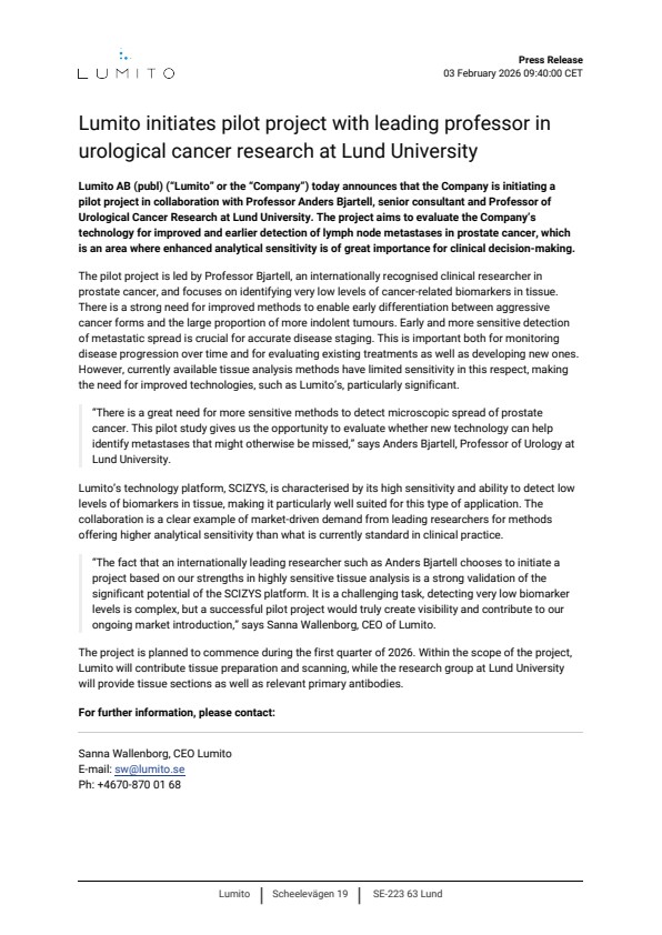 Lumito AB (publ) (“Lumito” or the “Company”) today announces that the Company is initiating a pilot project in collaboration with Professor Anders Bjartell, senior consultant and Professor of Urological Cancer Research at Lund University. The project aims to evaluate the Company’s technology for improved and earlier detection of lymph node metastases in prostate cancer, which is an area where enhanced analytical sensitivity is of great importance for clinical decision-making.