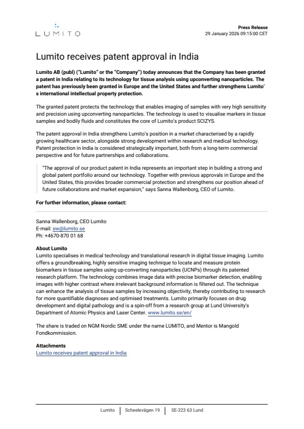 Lumito AB (publ) (“Lumito” or the “Company”) today announces that the Company has been granted a patent in India relating to its technology for tissue analysis using upconverting nanoparticles. The patent has previously been granted in Europe and the United States and further strengthens Lumito’s international intellectual property protection.