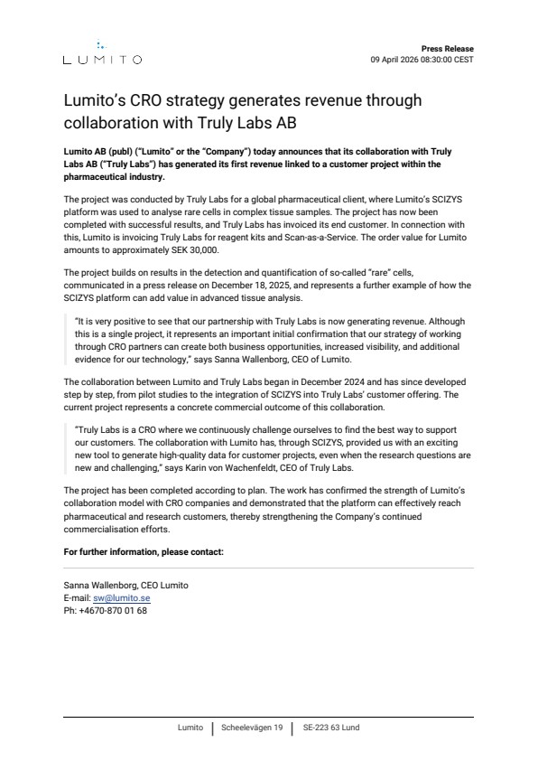 Lumito AB (publ) (“Lumito” or the “Company”) today announces that its collaboration with Truly Labs AB (“Truly Labs”) has generated its first revenue linked to a customer project within the pharmaceutical industry.