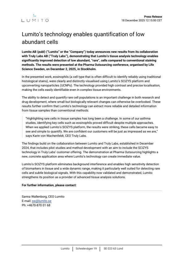 Lumito AB (publ) (“Lumito” or the “Company”) today announces new results from its collaboration with Truly Labs AB (“Truly Labs”), demonstrating that Lumito’s tissue analysis technology enables significantly improved detection of low abundant, “rare”, cells compared to conventional staining methods. The results were presented at the Pharma Outsourcing conference, organised by Life Science Sweden, on December 2, 2025, in Stockholm.