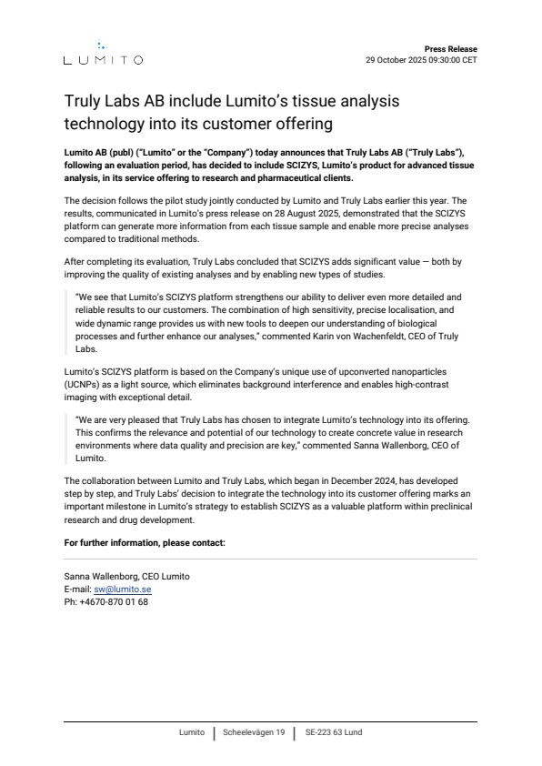 Lumito AB (publ) (“Lumito” or the “Company”) today announces that Truly Labs AB (“Truly Labs”), following an evaluation period, has decided to include SCIZYS, Lumito’s product for advanced tissue analysis, in its service offering to research and pharmaceutical clients.