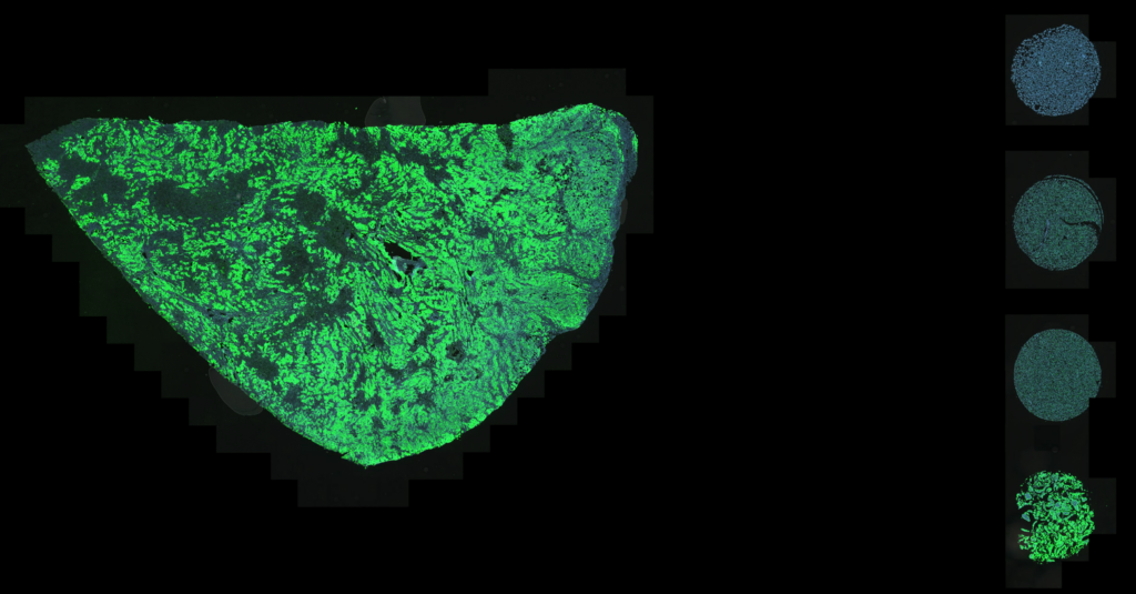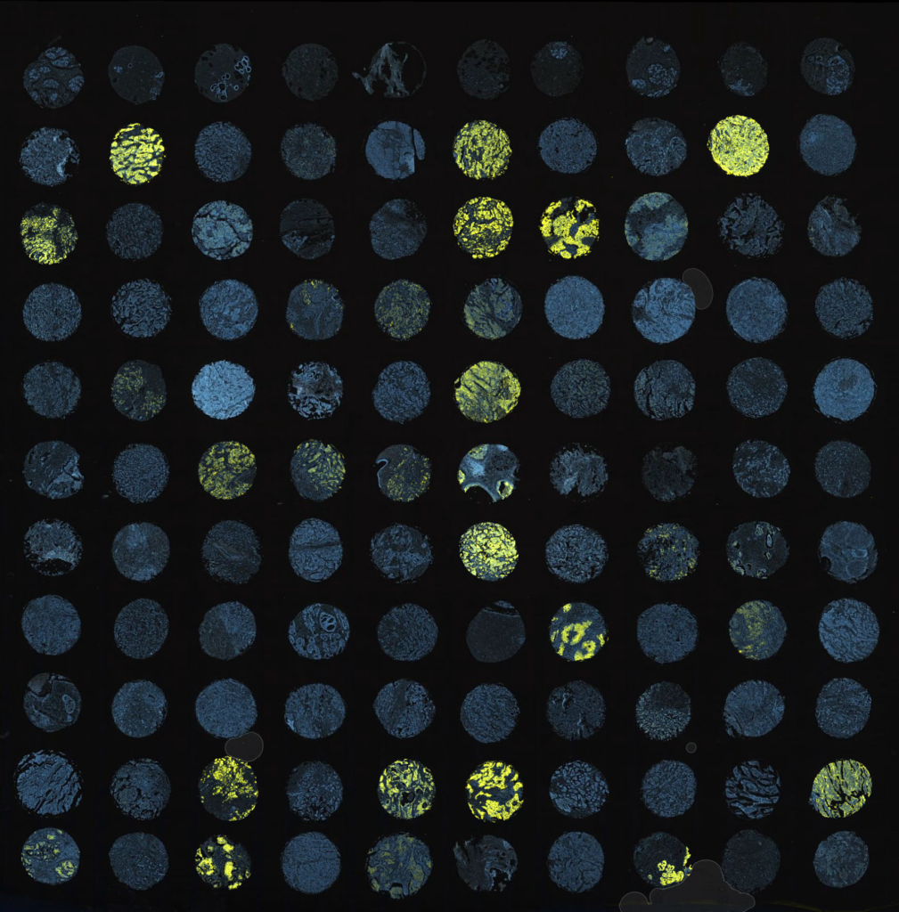 TMA with breast cancer biopsies labelled for HER2 (yellow)