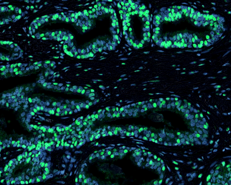 The below images are imaged with the Lumito SCIZYS whole slide imaging scanner, intended for research use. The SCIZYS scanner acquires images of two modalities, the standard RGB, or brightfield modality, and the UCNP fluorescence modality. Some images below have been inverted to give a black background to better showcase the biomarker signal from the SCIZYS UCNP kit. The UCNP channel can take any colour, but is usually depicted in a bright colour, as seen below.