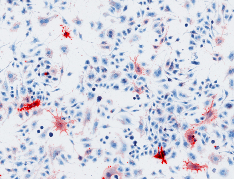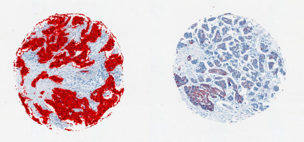 TMA breast cancer biopsies with different levels of HER2 (red)