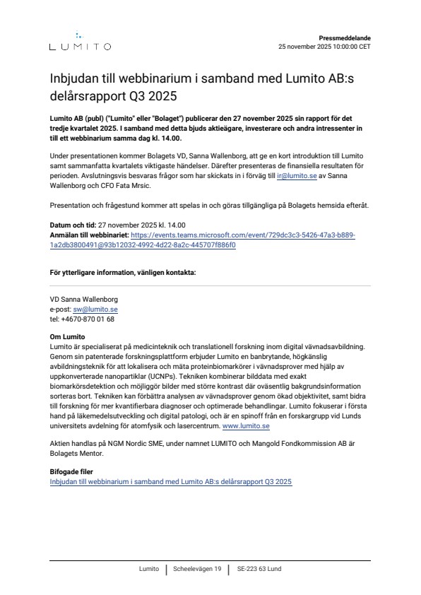 Lumito AB (publ) ("Lumito" eller "Bolaget") publicerar den 27 november 2025 sin rapport för det tredje kvartalet 2025. I samband med detta bjuds aktieägare, investerare och andra intressenter in till ett webbinarium samma dag kl. 14.00.