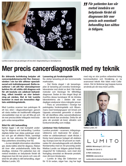 Lumito är specialiserat inom medicinsk teknik för digital patologi. Genom sin egenutvecklade och patenterade teknologi vill Lumito ge vårdgivarna ett kraftfullt verktyg för att möta kraven på snabb och säker vävnadsdiagnostik i den individanpassade sjukvården. Tekniken möjliggör bilder med större kontrast där oväsentlig bakgrundsinformation sorteras bort, vilket gör det lättare för patologer att hitta cancerindikationer. Tekniken som baseras på uppkonverterande nanopartiklar (UCNP – Up Converting Nano Particles) har förutsättningar att väsentligt förbättra diagnostiken av vävnadsprover genom högre kvalitet av analyserna och kortare analystider. Metoden har flera potentiella användningsområden, men i första hand har Lumito valt att fokusera på digital patologi. Bolaget är en spinoff från en forskargrupp vid Lunds universitets avdelning för atomfysik och lasercentrum. www.lumito.se.
