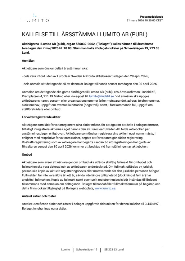Aktieägarna i Lumito AB (publ), org.nr 556832-0062, (”Bolaget”) kallas härmed till årsstämma torsdagen den 7 maj 2026 kl. 10.00. Stämman hålls i Bolagets lokaler på Scheelevägen 19, 223 63 Lund.