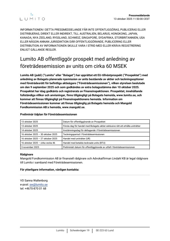 Lumito AB (publ) (”Lumito” eller ”Bolaget”) har upprättat ett EU-tillväxtprospekt (”Prospektet”) med anledning av Bolagets planerade nyemission av units bestående av aktier och teckningsoptioner med företrädesrätt för befintliga aktieägare (”Företrädesemissionen”), vilken styrelsen beslutade om den 9 september 2025 och som godkändes av extra bolagsstämma den 10 oktober 2025. Prospektet har idag godkänts och registrerats av Finansinspektionen. Prospektet, innehållande fullständiga villkor och anvisningar, finns tillgängligt på Bolagets hemsida, www.lumito.se, och kommer att finnas tillgängligt på Finansinspektionens hemsida. Information om Företrädesemissionen kommer att finnas tillgänglig på Bolagets hemsida och Mangold Fondkommission AB:s hemsida, www.mangold.se.