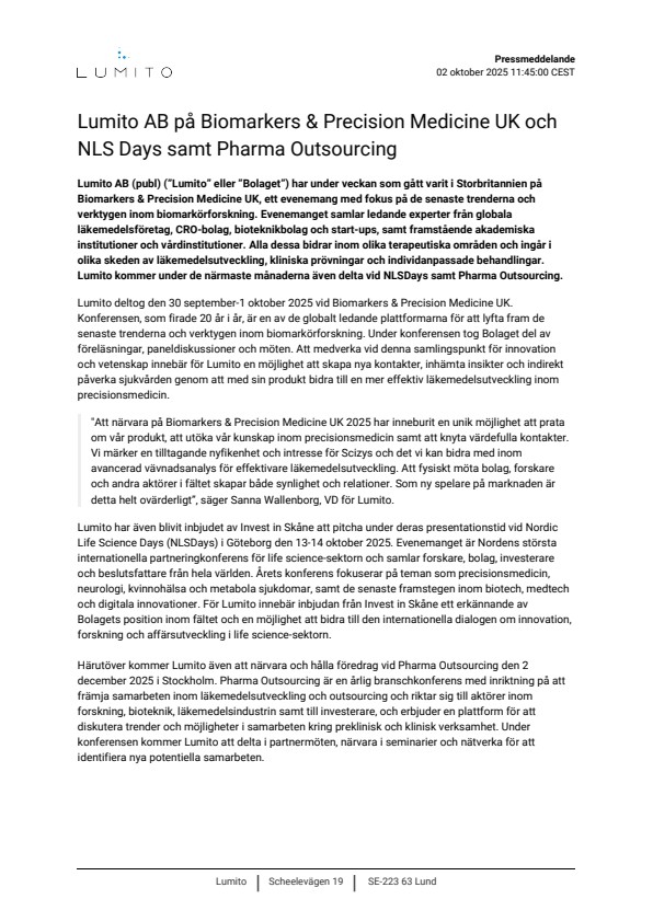 Lumito deltog den 30 september-1 oktober 2025 vid Biomarkers & Precision Medicine UK. Konferensen, som firade 20 år i år, är en av de globalt ledande plattformarna för att lyfta fram de senaste trenderna och verktygen inom biomarkörforskning. Under konferensen tog Bolaget del av föreläsningar, paneldiskussioner och möten. Att medverka vid denna samlingspunkt för innovation och vetenskap innebär för Lumito en möjlighet att skapa nya kontakter, inhämta insikter och indirekt påverka sjukvården genom att med sin produkt bidra till en mer effektiv läkemedelsutveckling inom precisionsmedicin.