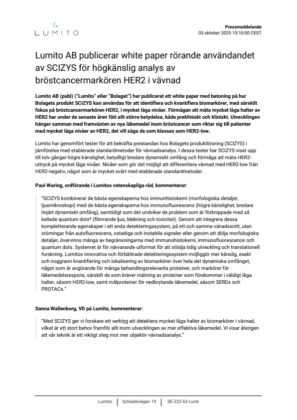 Lumito AB (publ) (”Lumito” eller ”Bolaget”) har publicerat ett white paper med betoning på hur Bolagets produkt SCIZYS kan användas för att identifiera och kvantifiera biomarkörer, med särskilt fokus på bröstcancermarkören HER2, i mycket låga nivåer. Förmågan att mäta mycket låga halter av HER2 har under de senaste åren fått allt större betydelse, både prekliniskt och kliniskt. Utvecklingen hänger samman med framväxten av nya läkemedel inom bröstcancer som riktar sig till patienter med mycket låga nivåer av HER2, det vill säga de som klassas som HER2-low.