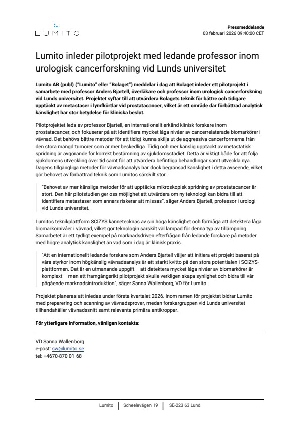 Lumito AB (publ) (”Lumito” eller ”Bolaget”) meddelar i dag att Bolaget inleder ett pilotprojekt i samarbete med professor Anders Bjartell, överläkare och professor inom urologisk cancerforskning vid Lunds universitet. Projektet syftar till att utvärdera Bolagets teknik för bättre och tidigare upptäckt av metastaser i lymfkörtlar vid prostatacancer, vilket är ett område där förbättrad analytisk känslighet har stor betydelse för kliniska beslut.