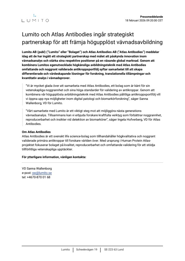 Lumito AB (publ) (”Lumito” eller ”Bolaget”) och Atlas Antibodies AB (”Atlas Antibodies”) meddelar idag att de har ingått ett strategiskt partnerskap med målet att påskynda innovation inom vävnadsanalys och stärka sina respektive positioner på en växande global marknad. Genom att kombinera Lumitos egenutvecklade högkänsliga avbildningsteknik med Atlas Antibodies omfattande och noggrant validerade antikroppsportfölj syftar samarbetet till att skapa differentierade och värdeskapande lösningar för forskning, translationella tillämpningar och kvantitativ analys i vävnadsprover.