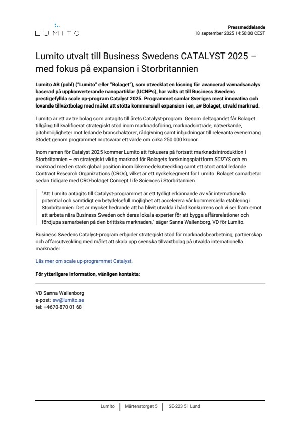 Lumito AB (publ) (”Lumito” eller ”Bolaget”), som utvecklat en lösning för avancerad vävnadsanalys baserad på uppkonverterande nanopartiklar (UCNPs), har valts ut till Business Swedens prestigefyllda scale up-program Catalyst 2025. Programmet samlar Sveriges mest innovativa och lovande tillväxtbolag med målet att stötta kommersiell expansion i en, av Bolaget, utvald marknad.