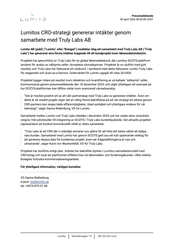 Projektet har genomförts av Truly Labs för en global läkemedelskund, där Lumitos SCIZYS-plattform använts för analys av sällsynta celler i komplexa vävnadsprover. Projektet är nu slutfört med gott resultat, och Truly Labs har fakturerat sin slutkund. I samband med detta fakturerar Lumito Truly Labs för reagenskit och Scan-as-a-Service. Ordervärdet för Lumito uppgår till cirka 30 kSEK.