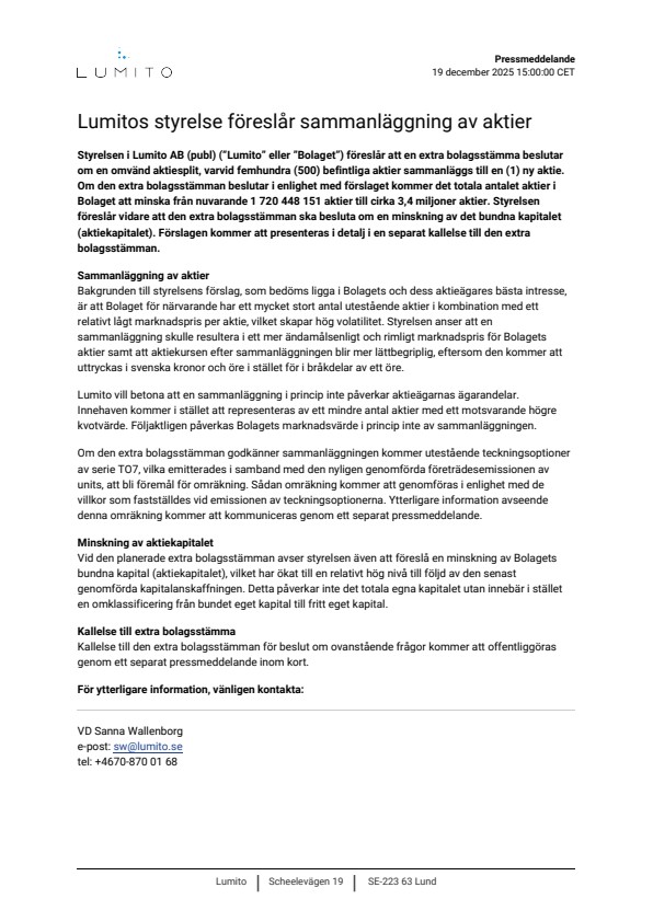 Styrelsen i Lumito AB (publ) (”Lumito” eller ”Bolaget”) föreslår att en extra bolagsstämma beslutar om en omvänd aktiesplit, varvid femhundra (500) befintliga aktier sammanläggs till en (1) ny aktie. Om den extra bolagsstämman beslutar i enlighet med förslaget kommer det totala antalet aktier i Bolaget att minska från nuvarande 1 720 448 151 aktier till cirka 3,4 miljoner aktier. Styrelsen föreslår vidare att den extra bolagsstämman ska besluta om en minskning av det bundna kapitalet (aktiekapitalet). Förslagen kommer att presenteras i detalj i en separat kallelse till den extra bolagsstämman.