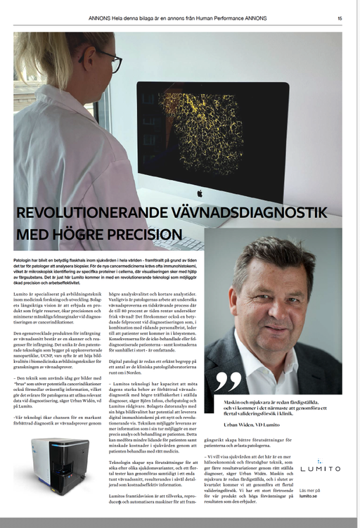 – Lumitos teknologi har kapacitet att möta dagens starka behov av förbättrad vävnadsdiagnostik med högre träffsäkerhet i ställda diagnoser, säger Björn Isfoss, chefspatolog och Lumitos rådgivare. Bolagets datoranalys med sin höga bildkvalitet har potential att leverera digital immunhistokemi på ett nytt och revolutionerande vis. Tekniken möjliggör leverans av mer information som i sin tur möjliggör en mer precis analys och behandling av patienten. Detta kan medföra mindre lidande för patienten samt minskade kostnader i sjukvården genom att patienten behandlas med rätt medicin.