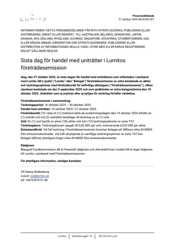 Idag, den 27 oktober 2025, är sista dagen för handel med uniträtterna som utfärdades i samband med Lumito AB:s (publ) (”Lumito” eller ”Bolaget”) företrädesemission av units bestående av aktier och teckningsoptioner med företrädesrätt för befintliga aktieägare (”Företrädesemissionen”), vilken styrelsen beslutade om den 9 september 2025 och som godkändes av extra bolagsstämma den 10 oktober 2025. Uniträtter som ej avyttras eller ej nyttjas för teckning förfaller värdelösa.
