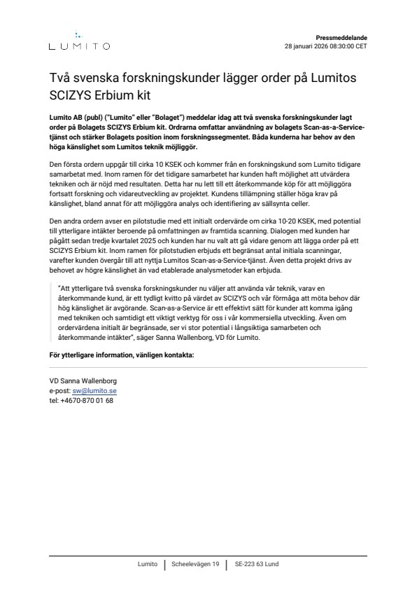 Lumito AB (publ) (”Lumito” eller ”Bolaget”) meddelar idag att två svenska forskningskunder lagt order på Bolagets SCIZYS Erbium kit. Ordrarna omfattar användning av bolagets Scan-as-a-Service-tjänst och stärker Bolagets position inom forskningssegmentet. Båda kunderna har behov av den höga känslighet som Lumitos teknik möjliggör.