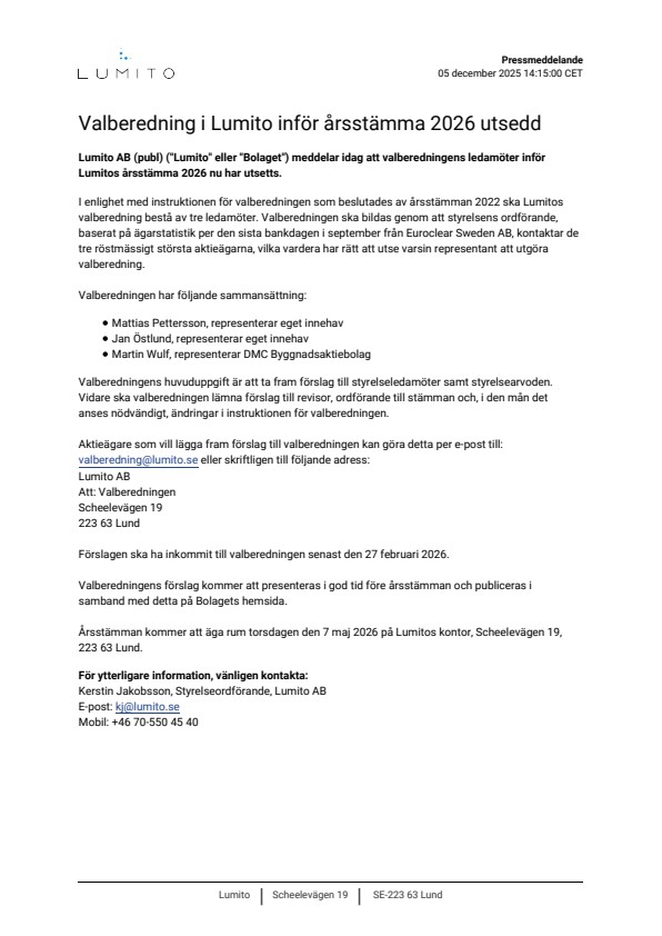 Lumito AB (publ) ("Lumito" eller "Bolaget") meddelar idag att valberedningens ledamöter inför Lumitos årsstämma 2026 nu har utsetts.